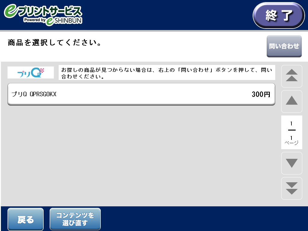 • 8.プリQで発行したコンテンツ番号を入力して「次へ進む」を選択し購入に進みます。